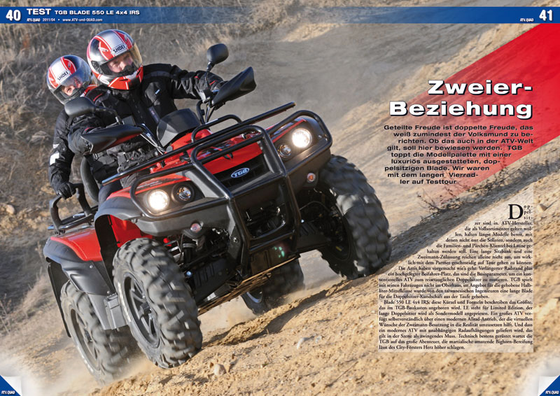 Zweier-Beziehung: Geteilte Freude ist doppelte Freude, das weiß zumindest der Volksmund zu berichten. Ob das auch in der ATV-Welt gilt, soll hier bewiesen werden. TGB toppt die Modellpalette mit einer luxuriös ausgestatteten, doppelsitzigen Blade. Wir waren mit dem langen Vierradler auf Testtour… Seite 40-47