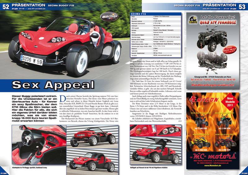 Geheim Projekt: Die Bayern trauen sich nicht – also muss Clemens Eicker ‘ran: Der Boss von E.-ATV hat sich auf die Fahnen geschrieben, die BMW R 1200 GS zum Quad umzubauen. Offiziell wird dementiert. Dabei soll das Fahrzeug bereits im Sommer 2011 präsentiert und im September auf der ersten Rallye, der Transanatolia, eingesetzt werden. Und das nicht, um dort als Zweiter anzukommen… Seite 28-29