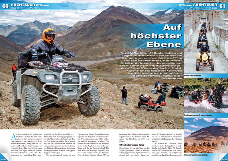 Auf höchster Ebene: Was zieht Abenteurer, Off-Roader, Kletterer und Bergsteiger immer wieder in den Himalaya und lässt sie danach schwören: „Nie wieder!“? Um dann doch wiederzukommen, immer wieder? Sie lieben oder hassen ihn, aber einmal dort gewesen, können sie ihn einfach nicht vergessen – das ist Teil des Charmes des Himalaya. Fred M. Krijgsman hat eine Gruppe von Abenteuern begleitet, die aufgebrochen ist, auf Quads und ATVs die höchsten Bergstraßen der Welt zu erobern… Seite 66-71