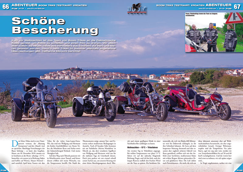 Schöne Bescherung: Kurz vor Weihnachten ist das Team von Boom Trikes an die Dalmatinische Küste gereist, um Fotos zu schießen und einen Film zu drehen. Vor allem aber sollten die neuen Trikes des Herstellers aus Sontheim auf Herz und Nieren getestet werden, damit’s beim Triken im Sommer allenfalls angenehme Überraschungen gibt. Catharina Albrecht berichtet… Seite 66-79