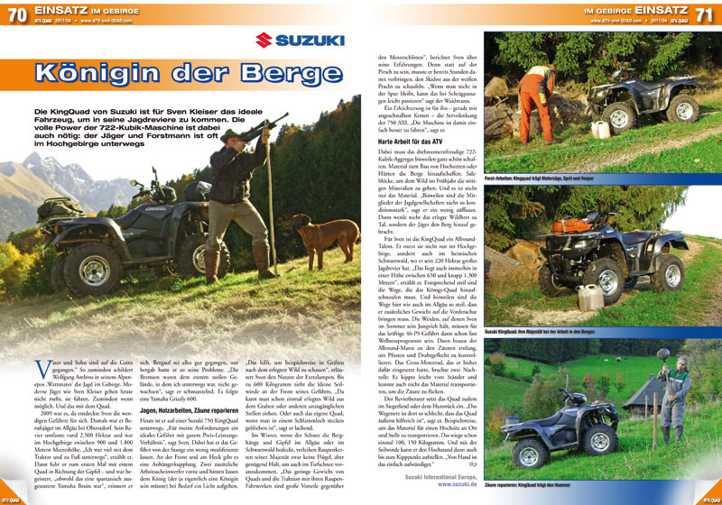 Königin der Berge: Die KingQuad von Suzuki ist für Sven Kleiser das ideale Fahrzeug, um in seine Jagdreviere zu kommen. Die volle Power der 722-Kubik-Maschine ist dabei auch nötig: der Jäger und Forstmann ist oft im Hochgebirge unterwegs… Seite 70-71