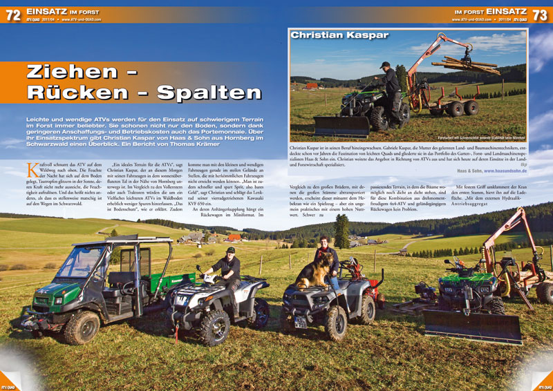 Ziehen – Rücken – Spalten: Leichte und wendige ATVs werden für den Einsatz auf schwierigem Terrain im Forst immer beliebter. Sie schonen nicht nur den Boden, sondern dank geringeren Anschaffungs- und Betriebskosten auch das Portemonnaie. Über ihr Einsatzspektrum gibt Christian Kaspar aus Hornberg im Schwarzwald einen Überblick. Ein Bericht von Thomas Krämer… Seite 72-74