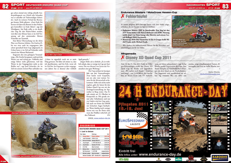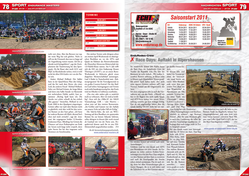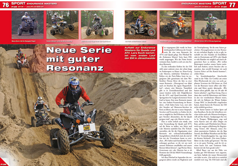 Neue Serie mit guter Resonanz: Auftakt zur Endurance Masters für Quads und ATV. Lars Koch berichtet vom ersten Lauf der EM in Jänschwalde… Seite 76-78