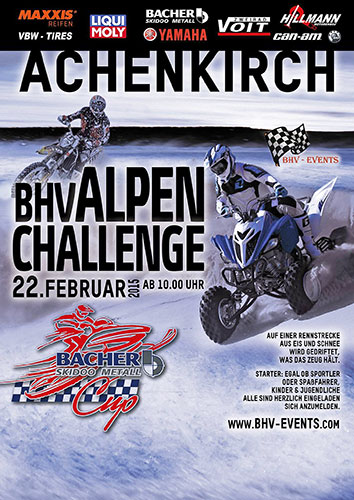 Mit der BHV Alpen Challenge starten drei Händler aus Bayern und Österreich einen neuen Winter-Cup mit Wertungsklassen für Quads, ATVs, Side-by-Sides und Motorschlitten. Was winterlichen Rennsport betrifft, handelt es sich bei den drei Händlern um keine Unbekannten: Harald Bacher (Bacher SkiDoo Metall in Mühlbach im Pinzgau), Uwe Hillmann (Hillmann Motorenbau in Aßling) und Günther Voit (Zweirad Voit in Mainburg Sandelzhausen) zählten bisher zu den tragenden